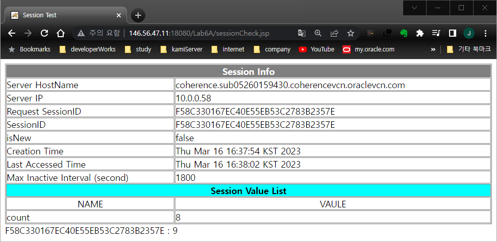 예제 Application은 Coherence에 세션객체를 저장하도록 구성되어 있습니다.